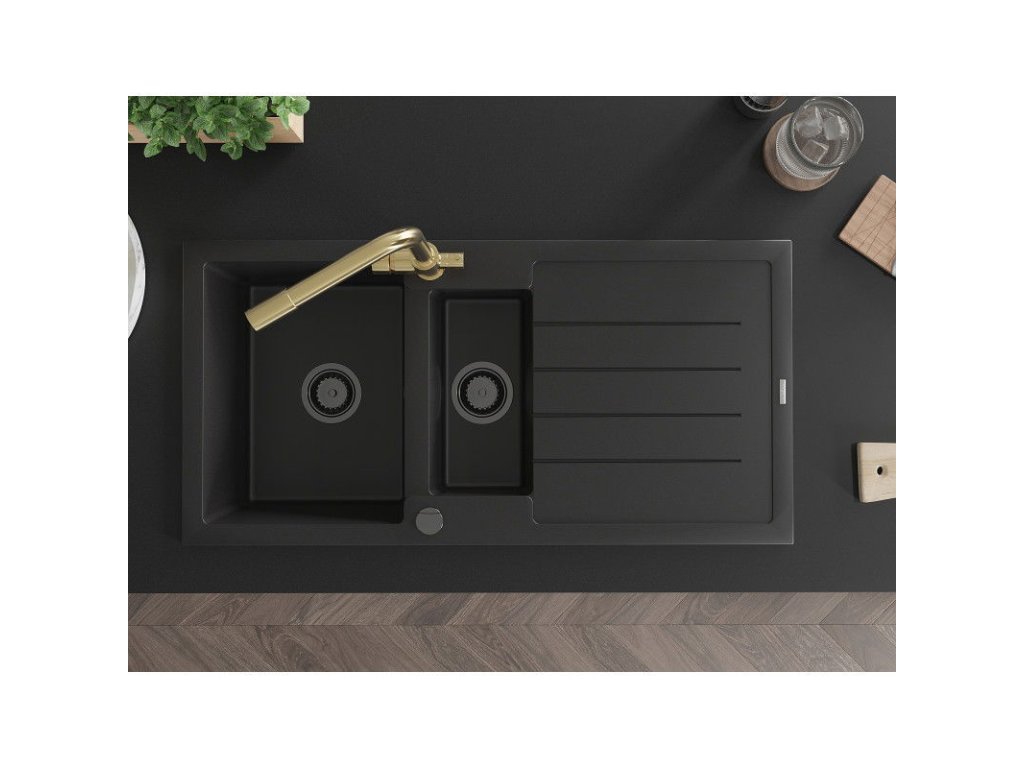 Granitový drez Mexen Andres s 1,5 misy, odkapávačom a kuchynskou batériou Duero, čierny - 6515-77-671600-50-B