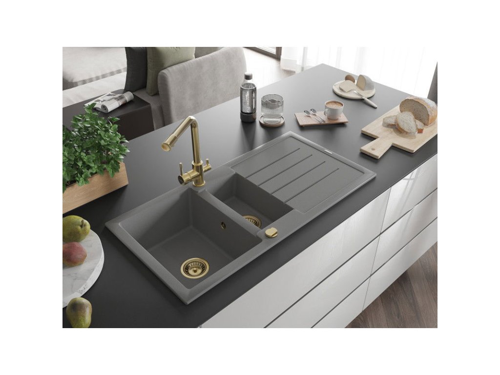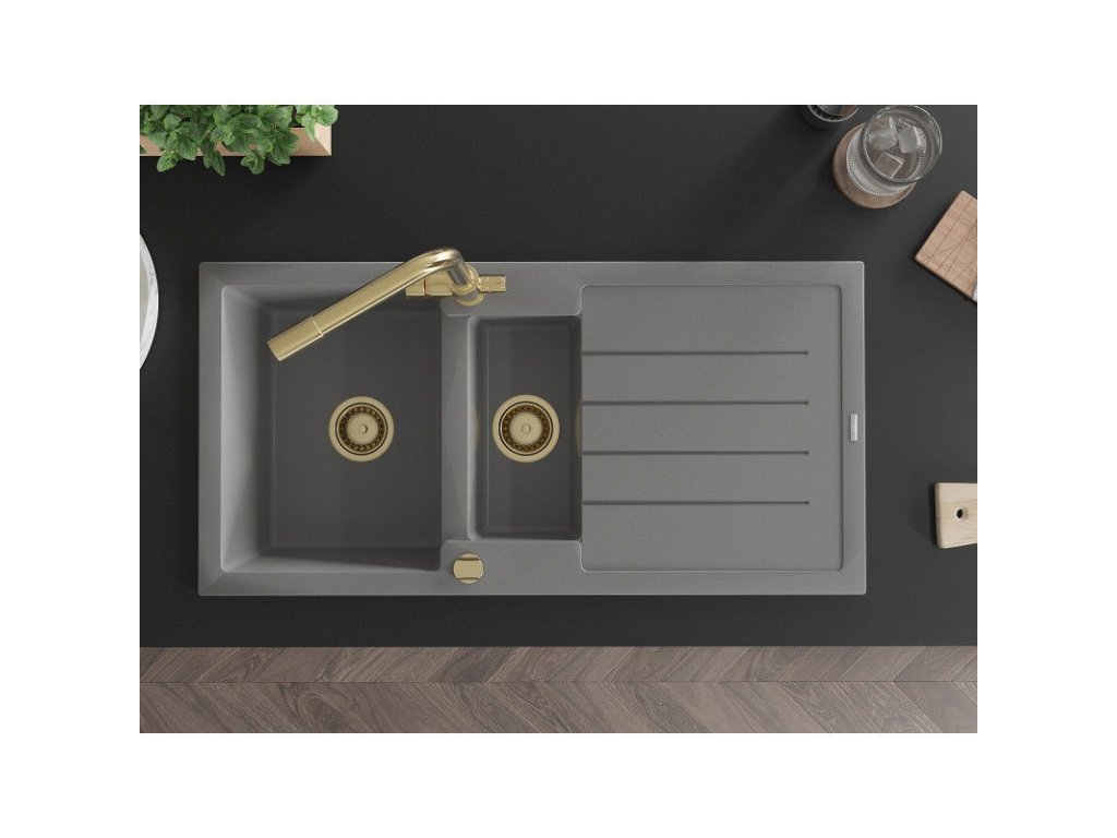 Granitový drez Mexen Andres s 1,5 misy, odkapávačom a kuchynskou batériou Duero, sivý - 6515-71-671600-50