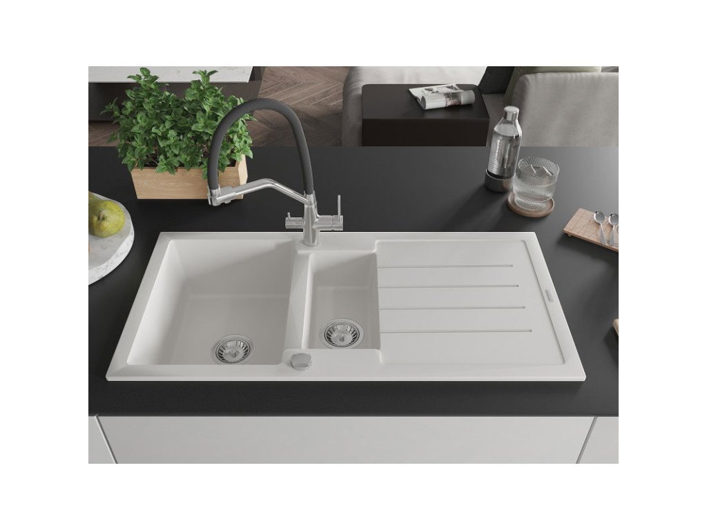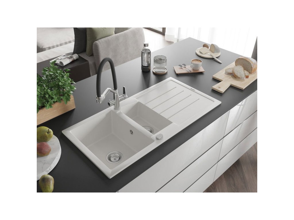 Granitový drez Mexen Andres s 1,5 misy, odkapávačom a kuchynskou batériou Duo, biely - 6515-20-671701-07