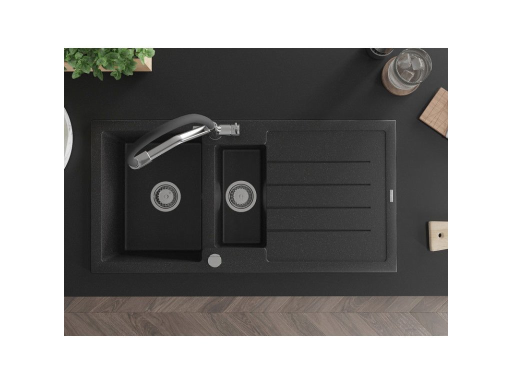 Granitový drez Mexen Andres s 1,5 misy, odkapávačom a kuchynskou batériou Duo, čierna/strieborná metalíza - 6515-73-671701-07