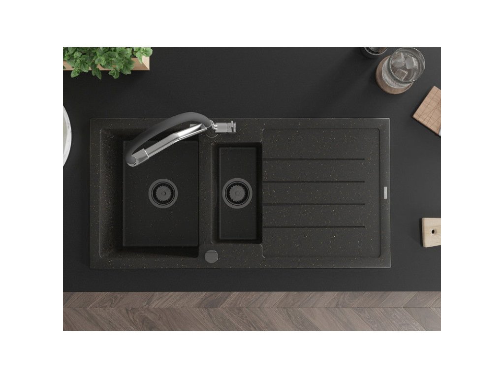 Granitový drez Mexen Andres s 1,5 misy, odkapávačom a kuchynskou batériou Duo, čierna/zlatá metalíza - 6515-75-671701-07-B