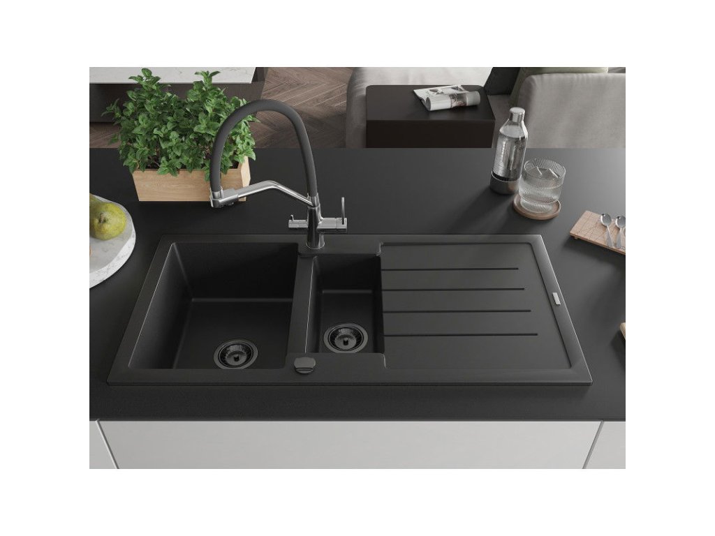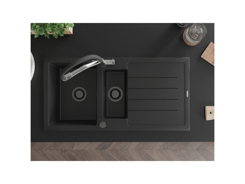 Granitový drez Mexen Andres s 1,5 misy, odkapávačom a kuchynskou batériou Duo, čierny - 6515-77-671701-07-B