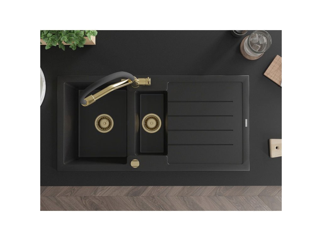 Granitový drez Mexen Andres s 1,5 misy, odkapávačom a kuchynskou batériou Duo, čierny - 6515-77-671701-57-G