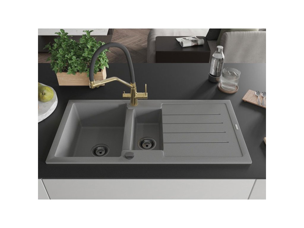 Granitový drez Mexen Andres s 1,5 misy, odkapávačom a kuchynskou batériou Duo, sivý - 6515-71-671701-57-B