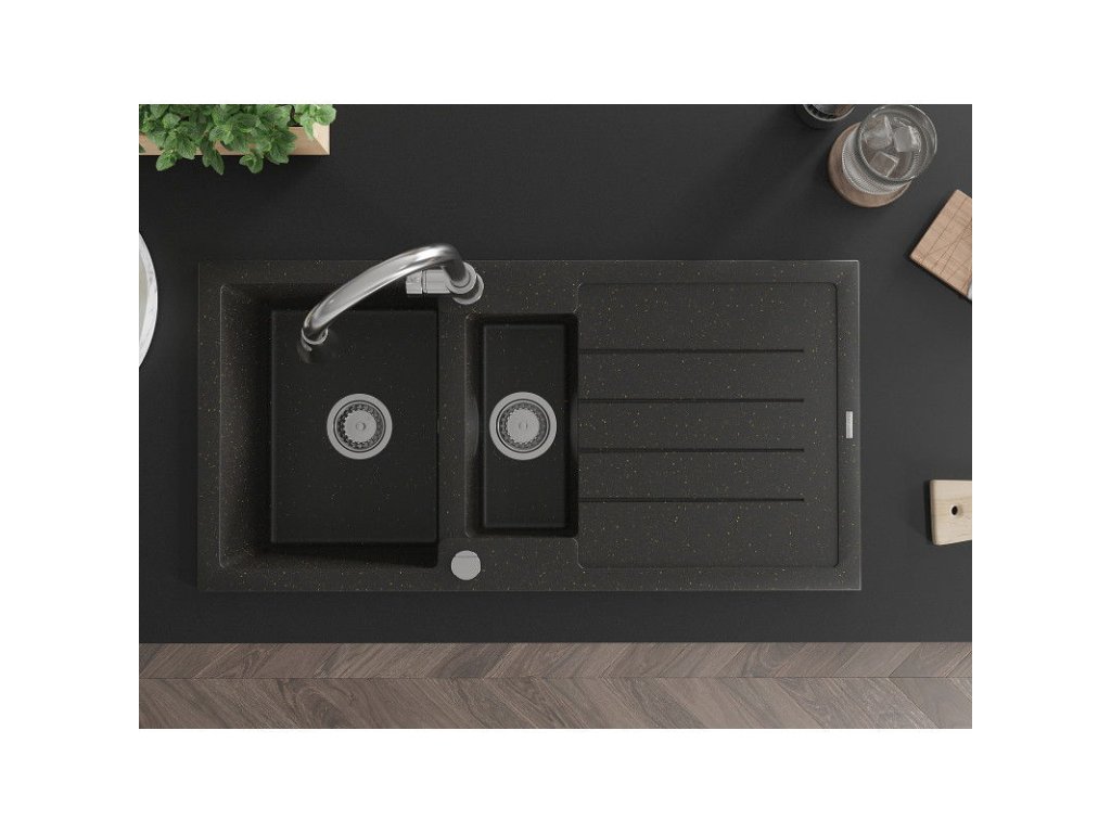 Granitový drez Mexen Andres s 1,5 misy, odkapávačom a kuchynskou batériou Elia, čierna/zlatá metalíza - 6515-75-670101-00