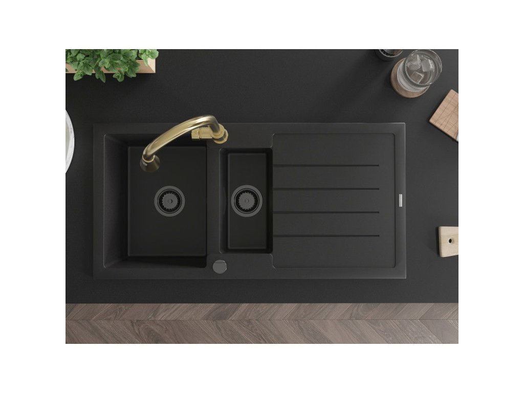 Granitový drez Mexen Andres s 1,5 misy, odkapávačom a kuchynskou batériou Elia, čierny - 6515-77-670101-50-B