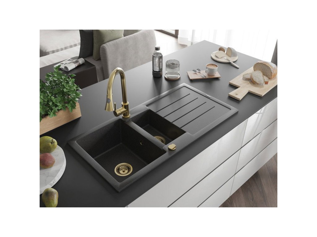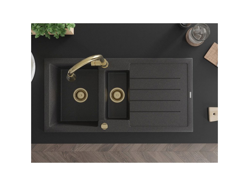 Granitový drez Mexen Andres s 1,5 misy, odkapávačom a kuchynskou batériou Elia, čierny bodkovaný - 6515-76-670101-50