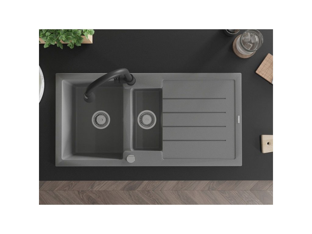 Granitový drez Mexen Andres s 1,5 misy, odkapávačom a kuchynskou batériou Elia, sivý - 6515-71-670101-70