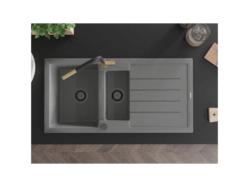 Granitový drez Mexen Andres s 1,5 misy, odkapávačom a kuchynskou batériou Flora, sivý - 6515-71-670401-57-B