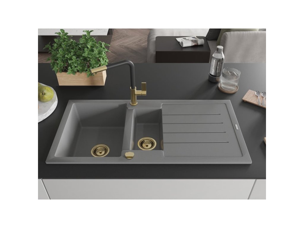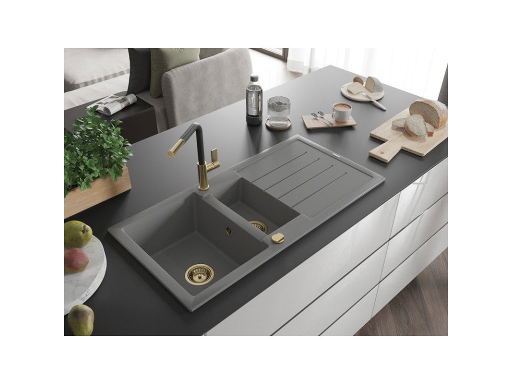 Granitový drez Mexen Andres s 1,5 misy, odkapávačom a kuchynskou batériou Flora, sivý - 6515-71-670401-57-G