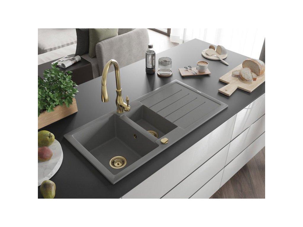 Granitový drez Mexen Andres s 1,5 misy, odkapávačom a kuchynskou batériou Savita, sivý - 6515-71-672601-50