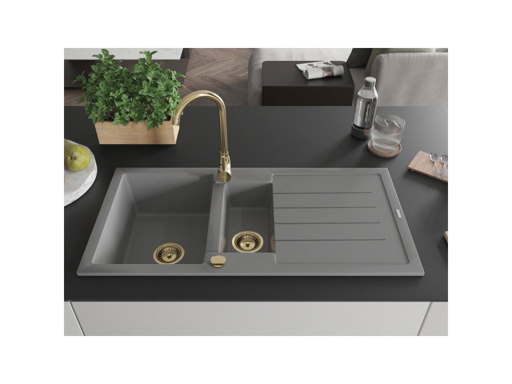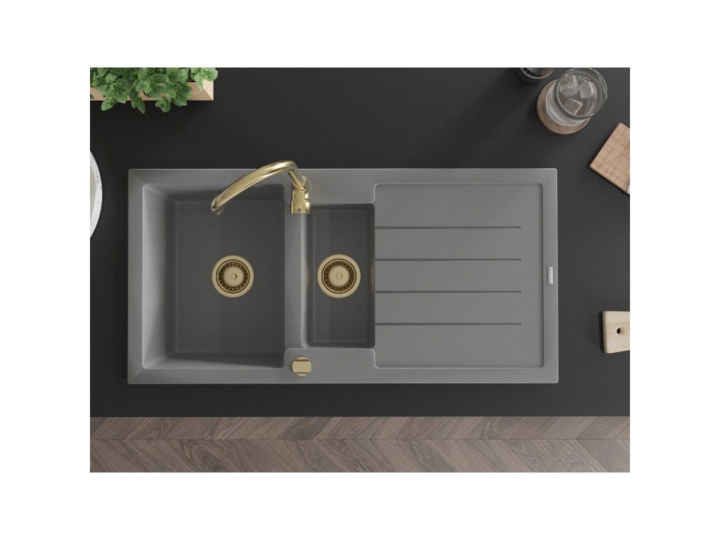 Granitový drez Mexen Andres s 1,5 misy, odkapávačom a kuchynskou batériou Telma, sivý - 6515-71-670200-50