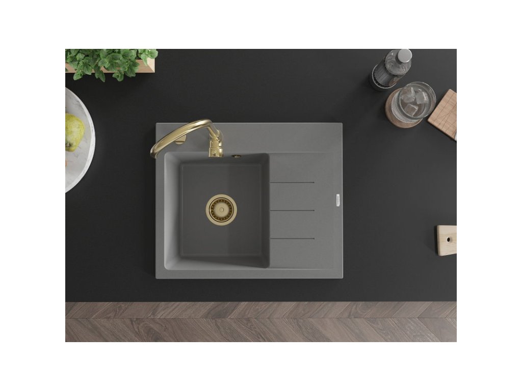 Granitový drez Mexen Ben s 1 misou a odkapávačom vľavo 600 x 500 mm, sivý, zlatý sifón - 6522605000-71-G