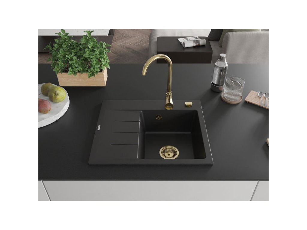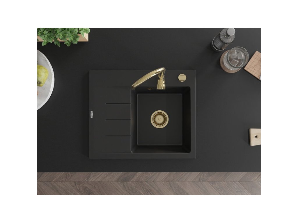 Granitový drez Mexen Ben s 1 misou a odkapávačom vpravo 600 x 500 mm, čierny, zlatý sifón - 6523605000-77-G