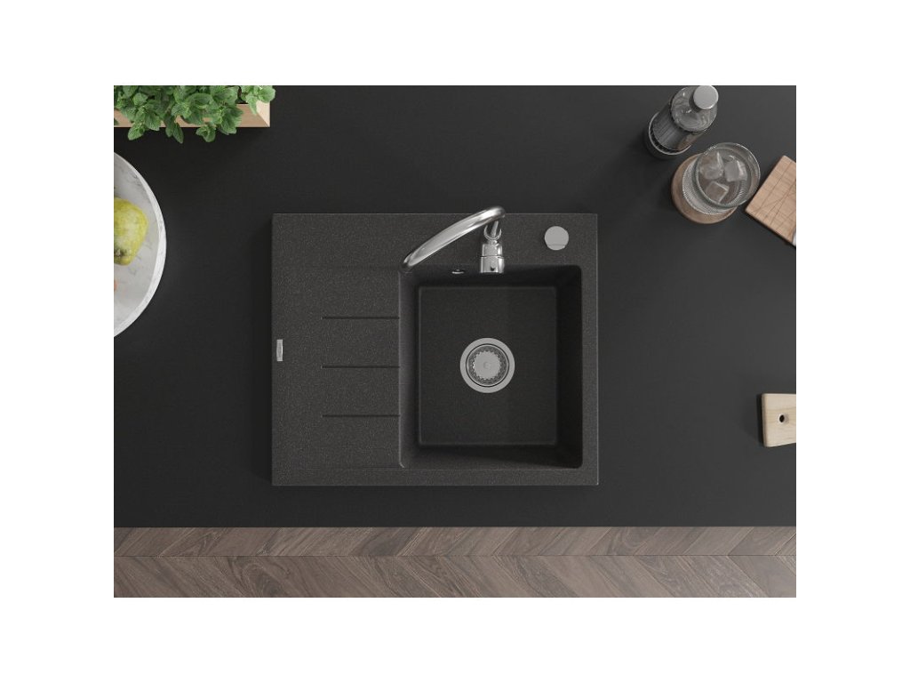 Granitový drez Mexen Ben s 1 misou a odkapávačom vpravo 600 x 500 mm, čierny bodkovaný, chrómový sifón - 6523605000-76