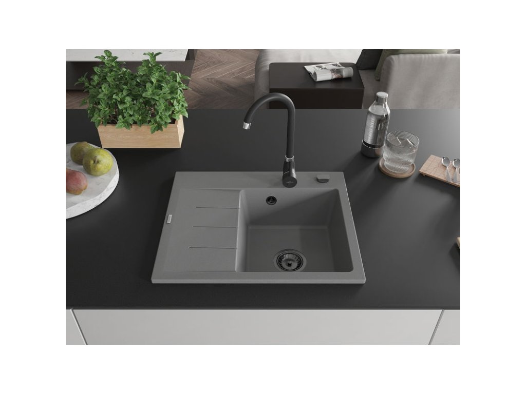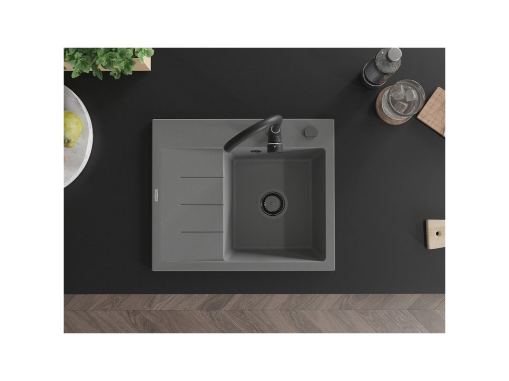 Granitový drez Mexen Ben s 1 misou a odkapávačom vpravo 600 x 500 mm, sivý, čierny sifón - 6523605000-71-B