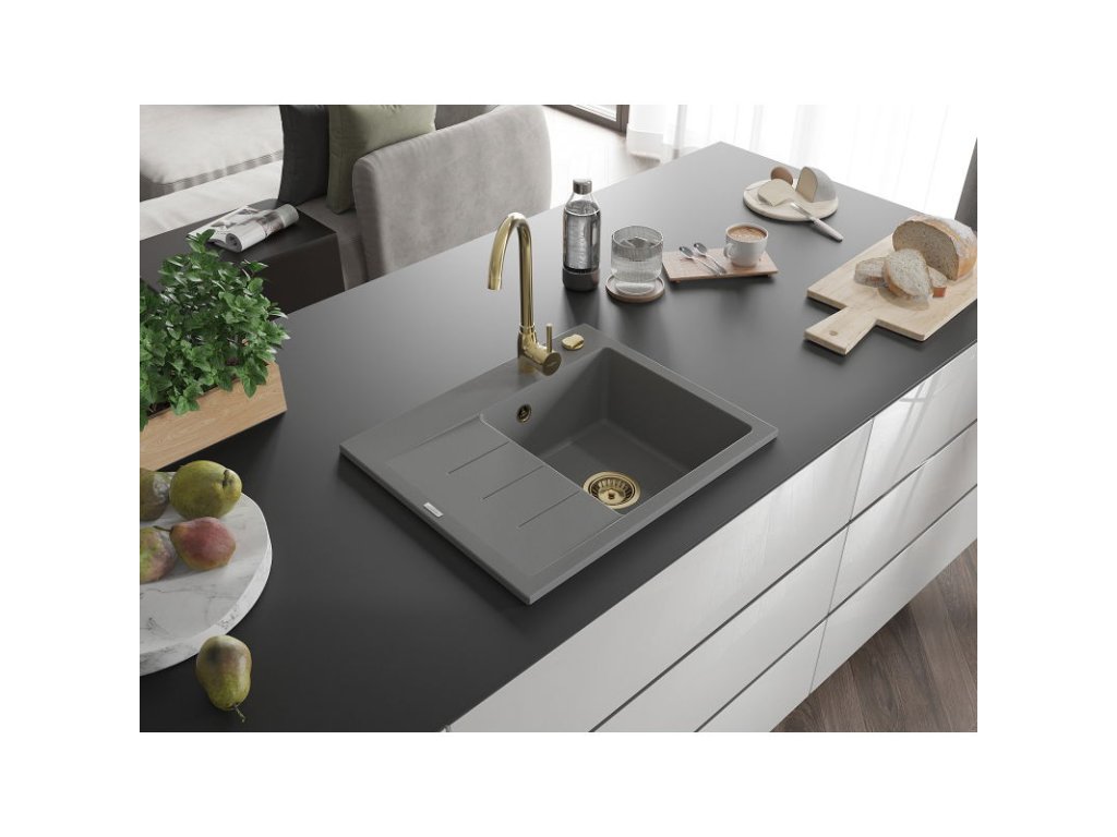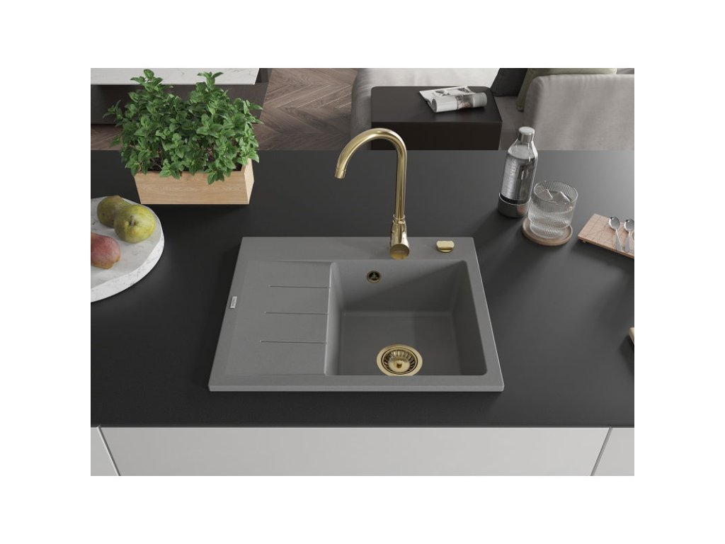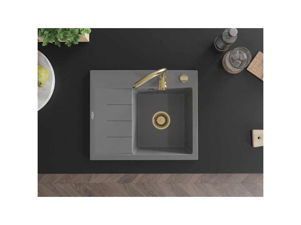 Granitový drez Mexen Ben s 1 misou a odkapávačom vpravo 600 x 500 mm, sivý, zlatý sifón - 6523605000-71-G