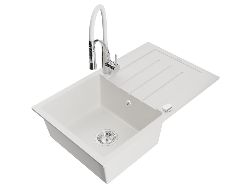 Granitový drez Mexen Bruno s 1 misou, odkapávačom a batériou Aster, biely - 6513-20-73450-02