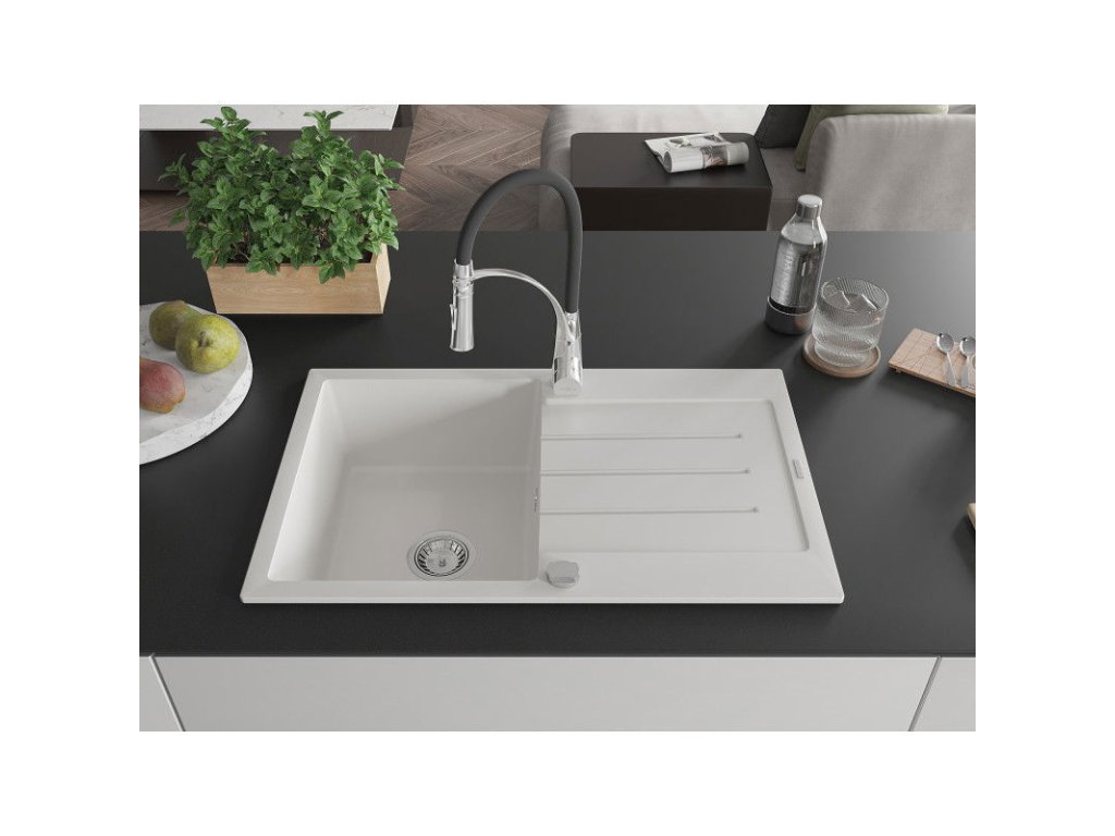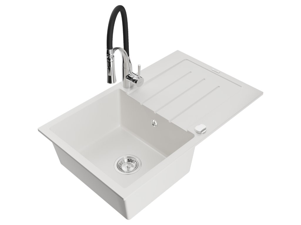 Granitový drez Mexen Bruno s 1 misou, odkapávačom a batériou Aster, biely - 6513-20-73450-07