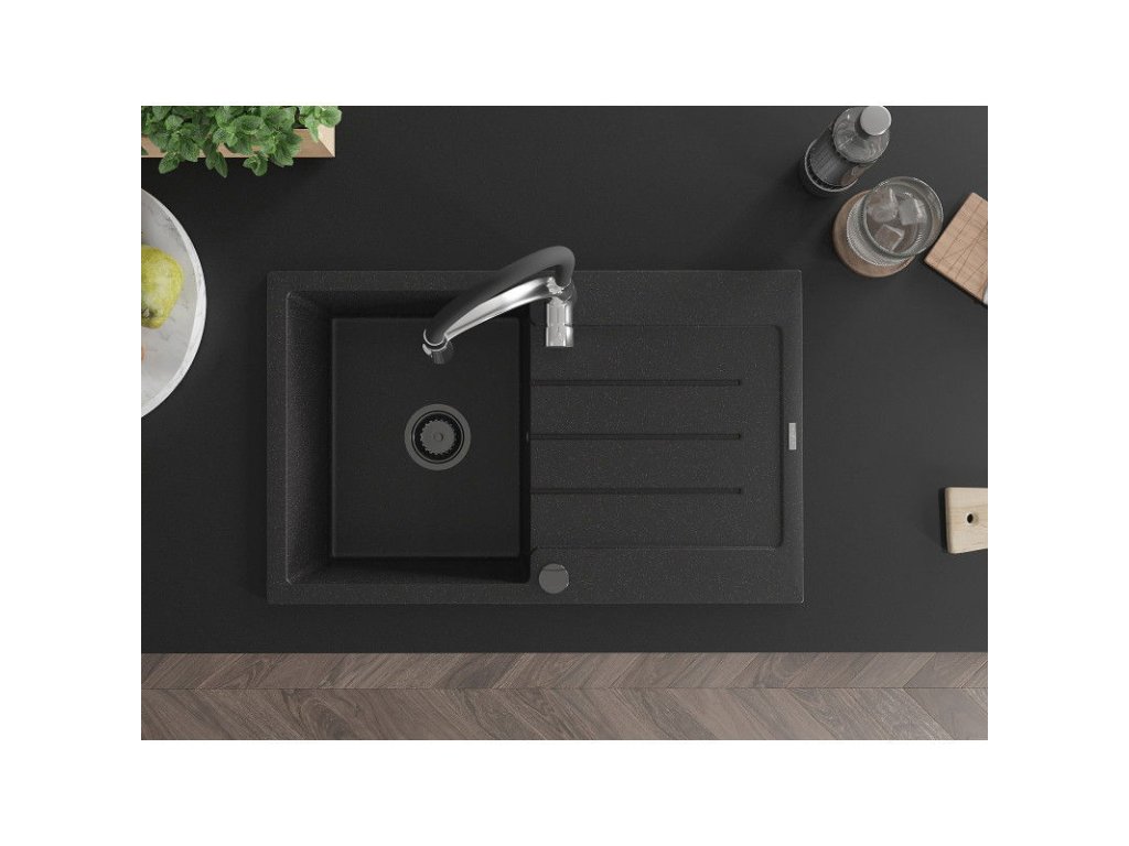 Granitový drez Mexen Bruno s 1 misou, odkapávačom a batériou Aster, čierna/strieborná metalíza - 6513-73-73450-07-B