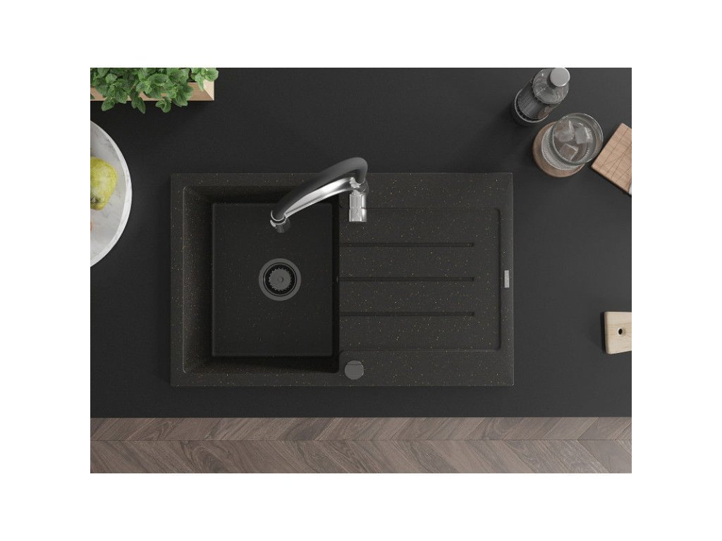 Granitový drez Mexen Bruno s 1 misou, odkapávačom a batériou Aster, čierna/zlatá metalíza - 6513-75-73450-07-B