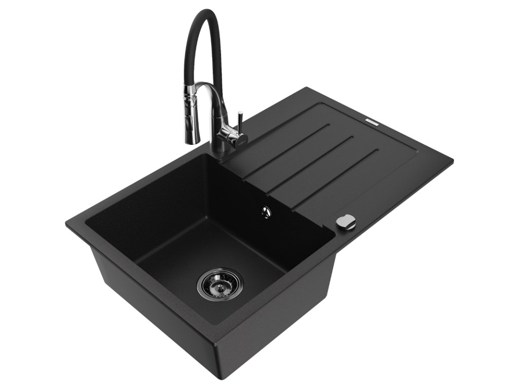 Granitový drez Mexen Bruno s 1 misou, odkapávačom a batériou Aster, čierny - 6513-77-73450-07-B