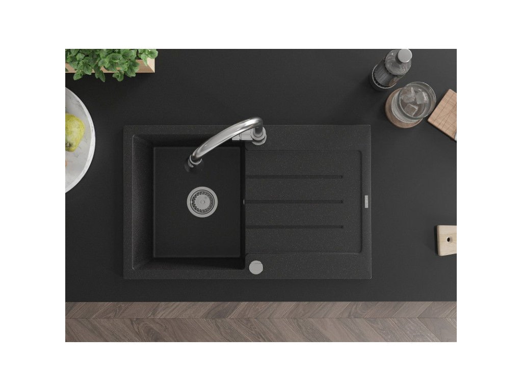 Granitový drez Mexen Bruno s 1 misou, odkapávačom a batériou Elia, čierna/strieborná metalíza - 6513-73-670101-00
