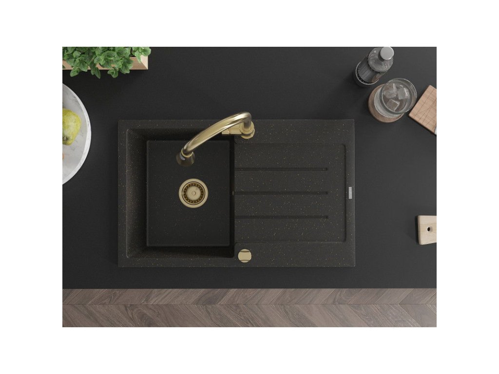 Granitový drez Mexen Bruno s 1 misou, odkapávačom a batériou Elia, čierna/zlatá metalíza - 6513-75-670101-50