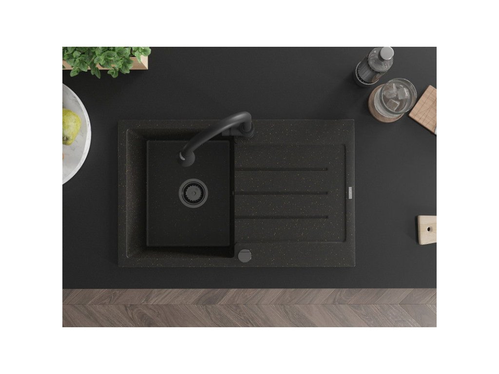 Granitový drez Mexen Bruno s 1 misou, odkapávačom a batériou Elia, čierna/zlatá metalíza - 6513-75-670101-70-B