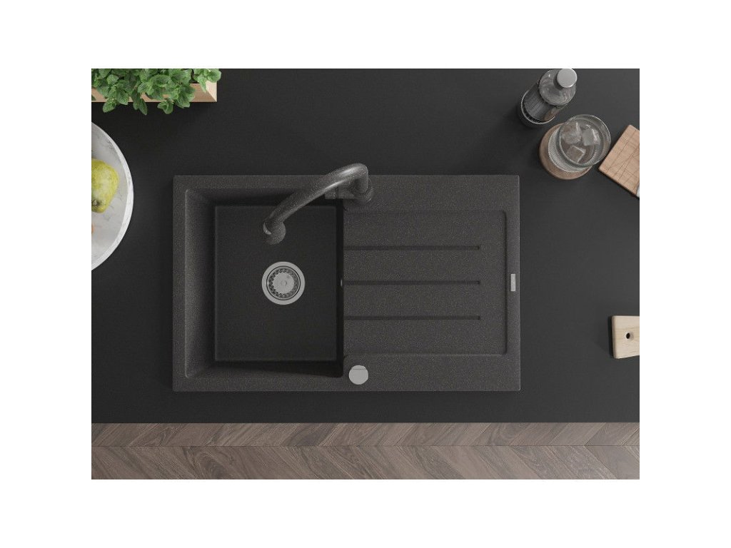 Granitový drez Mexen Bruno s 1 misou, odkapávačom a batériou Elia, čierny bodkovaný - 6513-76-670101-76