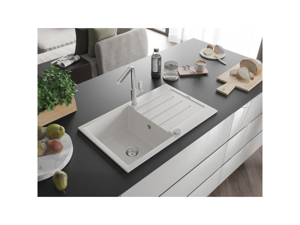 Granitový drez Mexen Bruno s 1 misou, odkapávačom a batériou Flora, biely - 6513-20-670401-00