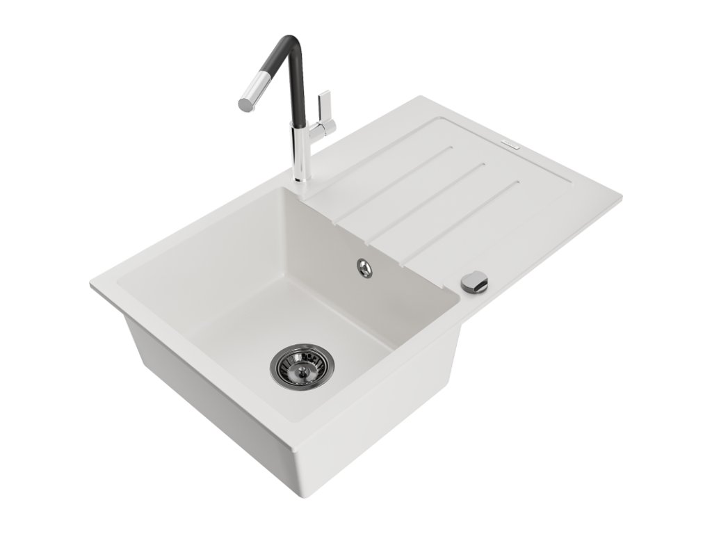 Granitový drez Mexen Bruno s 1 misou, odkapávačom a batériou Flora, biely - 6513-20-670401-07-B