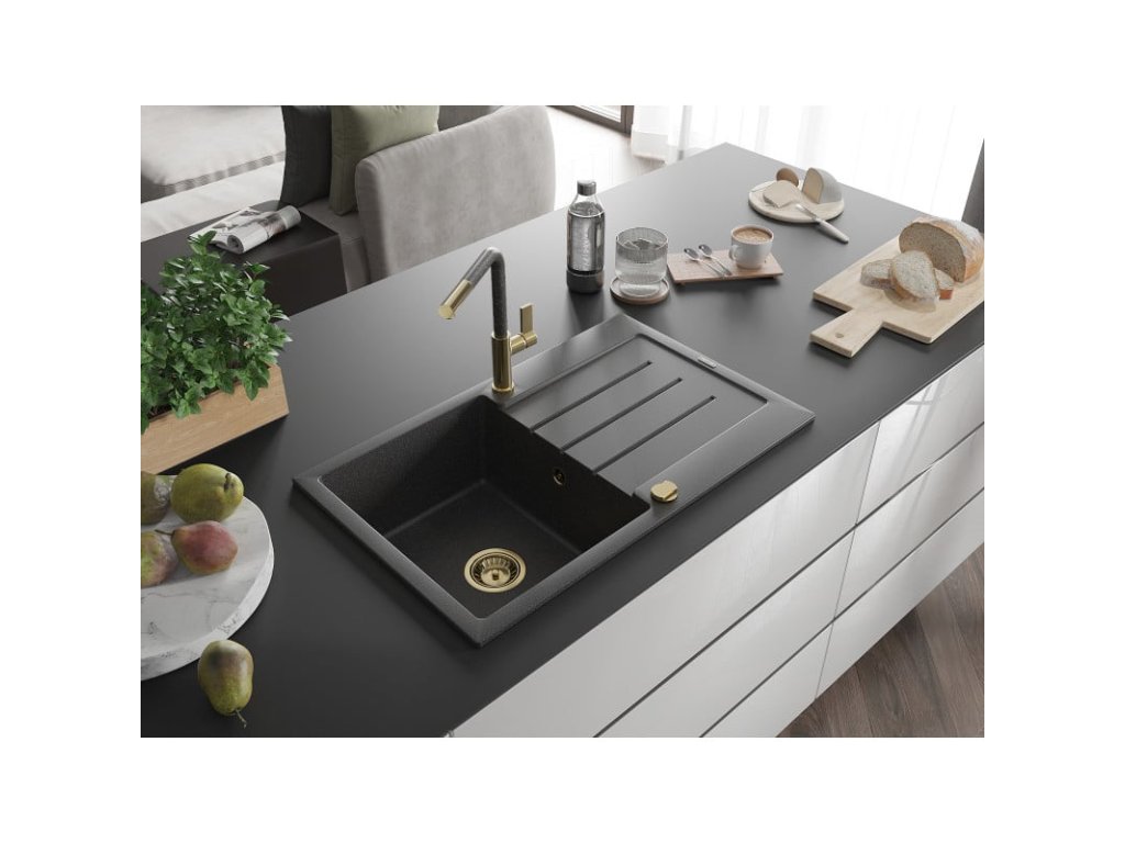 Granitový drez Mexen Bruno s 1 misou, odkapávačom a batériou Flora, čierna škvrna - 6513-76-670401-75-G