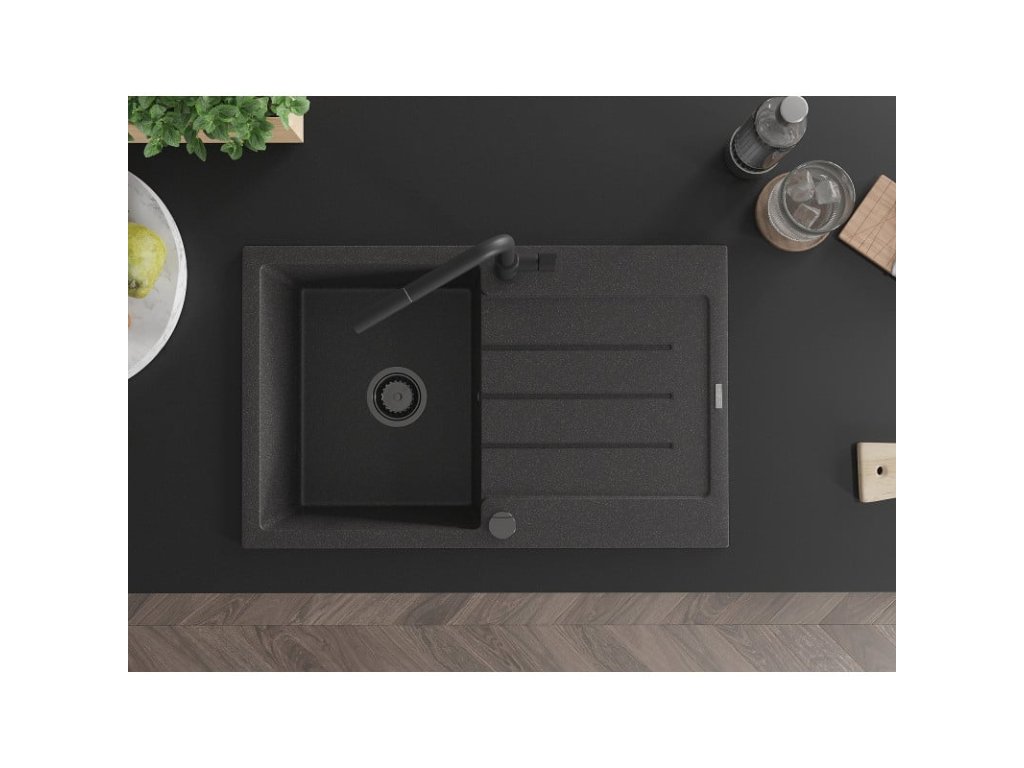 Granitový drez Mexen Bruno s 1 misou, odkapávačom a batériou Flora, čierna škvrnitá - 6513-76-670401-70-B