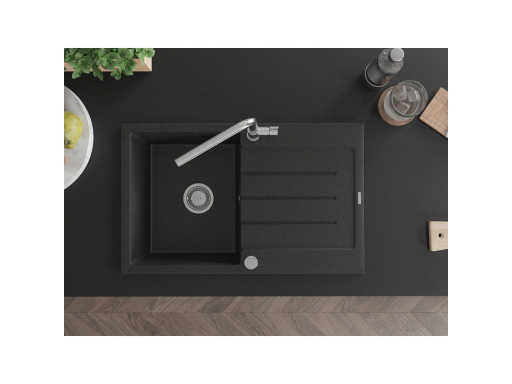 Granitový drez Mexen Bruno s 1 misou, odkapávačom a batériou Flora, čierna/strieborná metalíza - 6513-73-670401-00