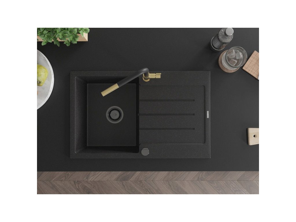 Granitový drez Mexen Bruno s 1 misou, odkapávačom a batériou Flora, čierna/strieborná metalíza - 6513-73-670401-57-B