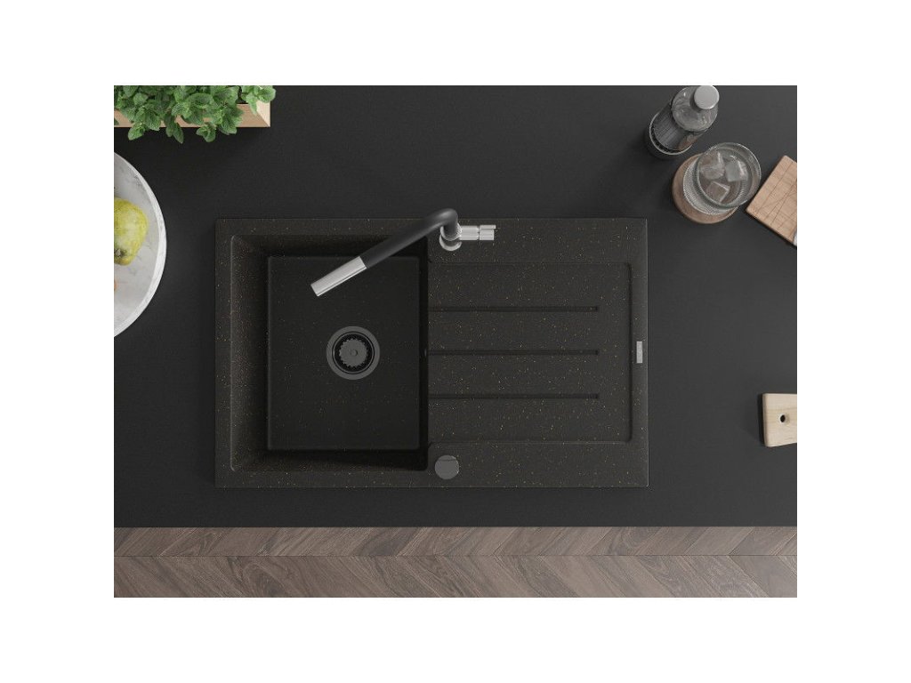 Granitový drez Mexen Bruno s 1 misou, odkapávačom a batériou Flora, čierna/zlatá metalíza - 6513-75-670401-07-B