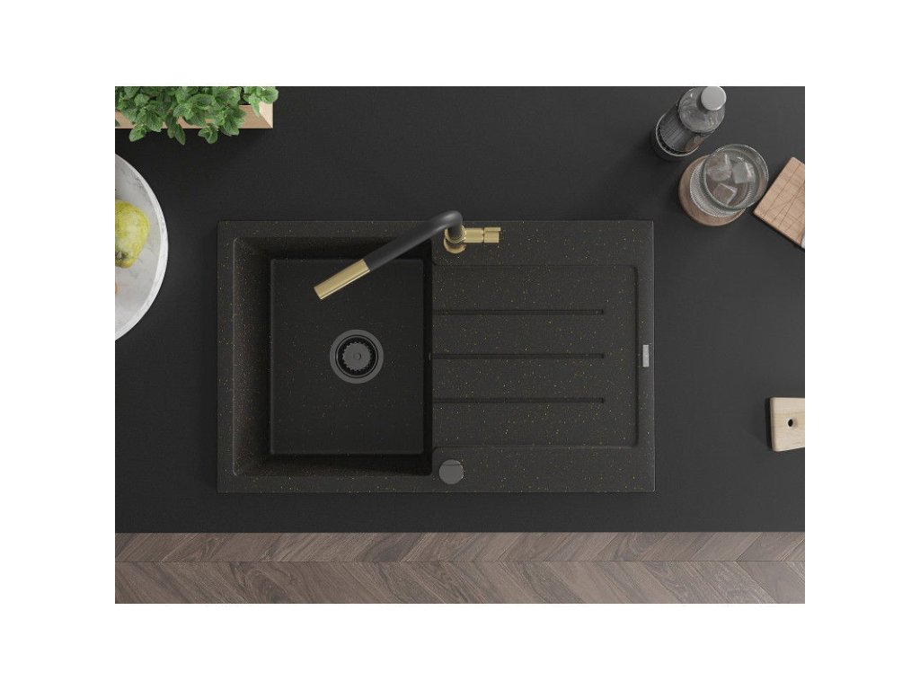 Granitový drez Mexen Bruno s 1 misou, odkapávačom a batériou Flora, čierna/zlatá metalíza - 6513-75-670401-57-B