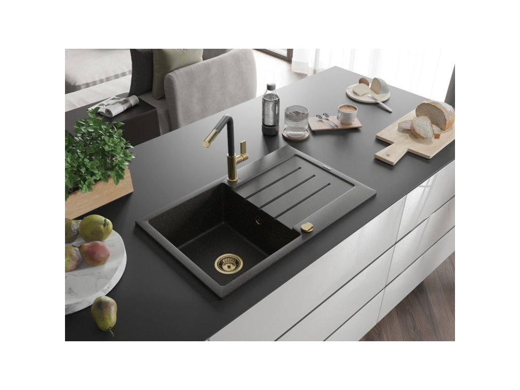 Granitový drez Mexen Bruno s 1 misou, odkapávačom a batériou Flora, čierna/zlatá metalíza - 6513-75-670401-57-G
