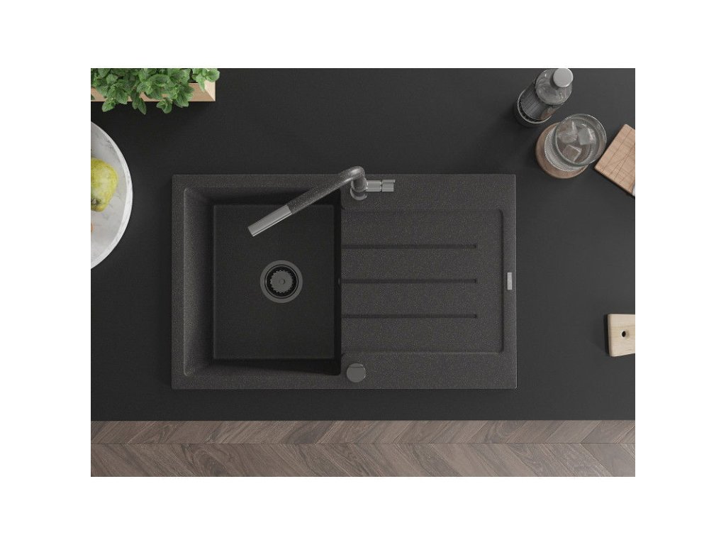 Granitový drez Mexen Bruno s 1 misou, odkapávačom a batériou Flora, čierny bodkovaný - 6513-76-670401-08-B