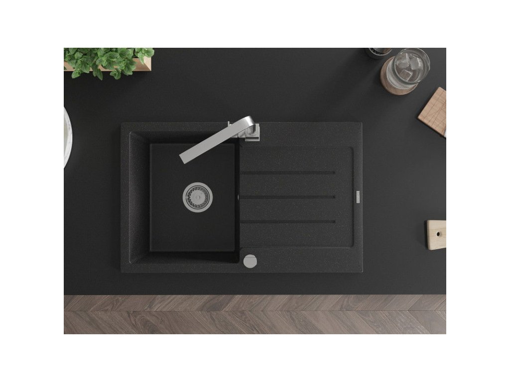 Granitový drez Mexen Bruno s 1 misou, odkapávačom a batériou Rita, čierna/strieborná metalíza - 6513-73-670300-00