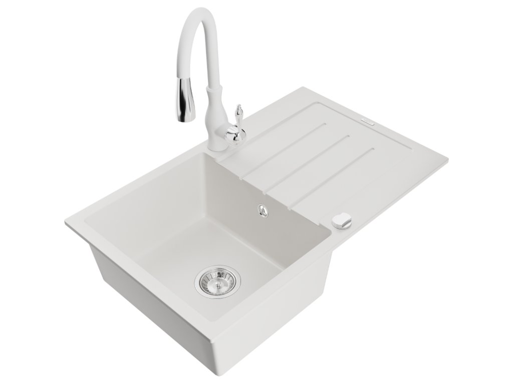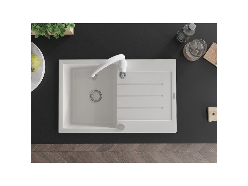Granitový drez Mexen Bruno s 1 misou, odkapávačom a batériou Savita, biely - 6513-20-672601-20