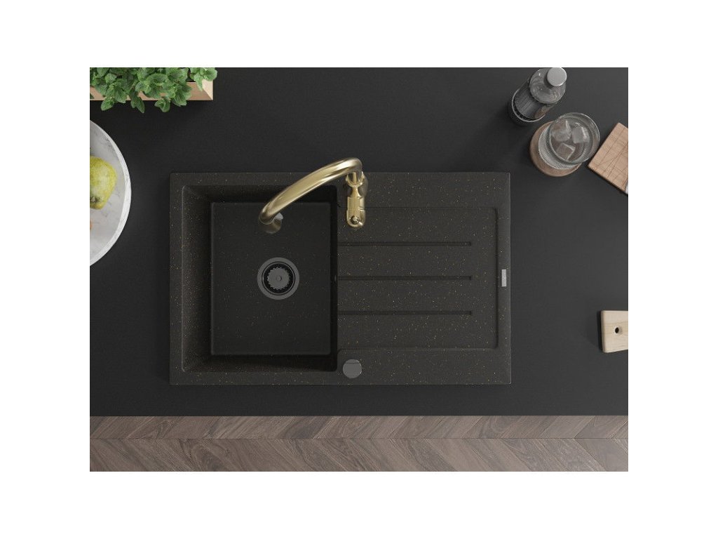 Granitový drez Mexen Bruno s 1 misou, odkapávačom a batériou Savita, čierna/zlatá metalíza - 6513-75-672601-50-B