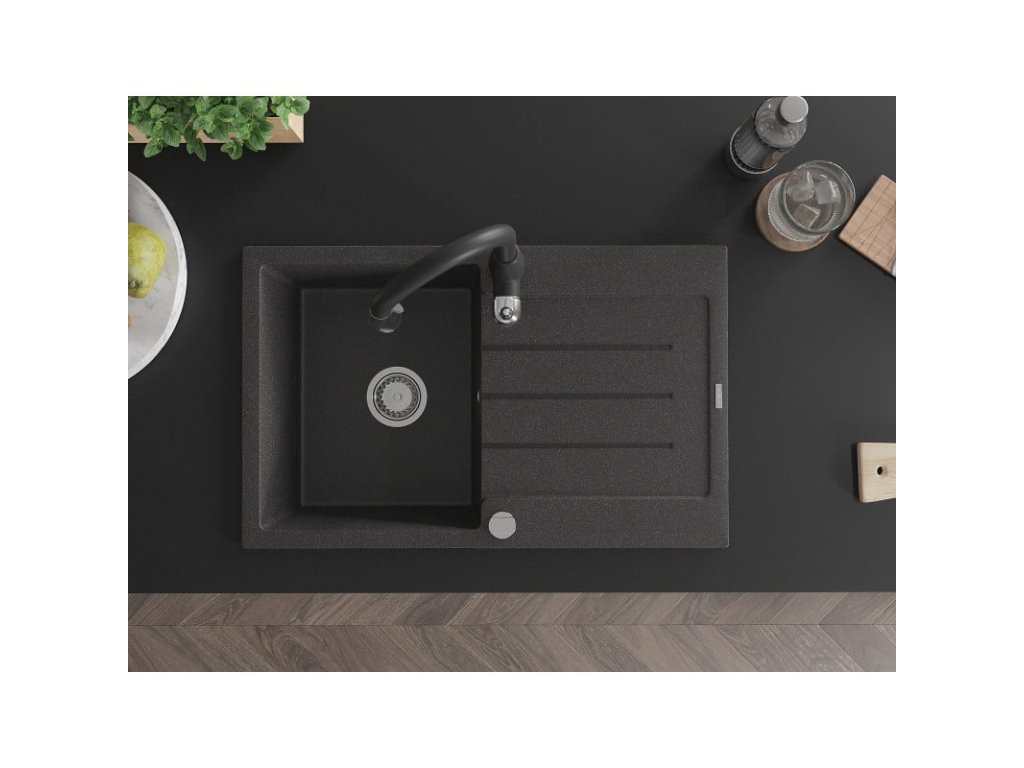 Granitový drez Mexen Bruno s 1 misou, odkapávačom a batériou Savita, čierny bodkovaný - 6513-76-672601-70
