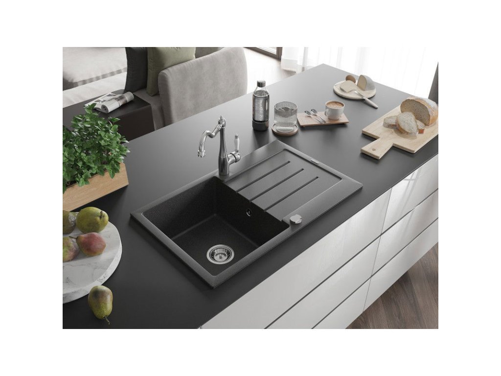 Granitový drez Mexen Bruno s 1 misou, odkapávačom a kuchynskou batériou Carla, čierny bodkovaný - 6513-76-670700-00
