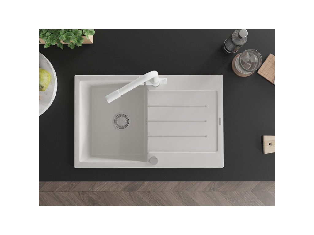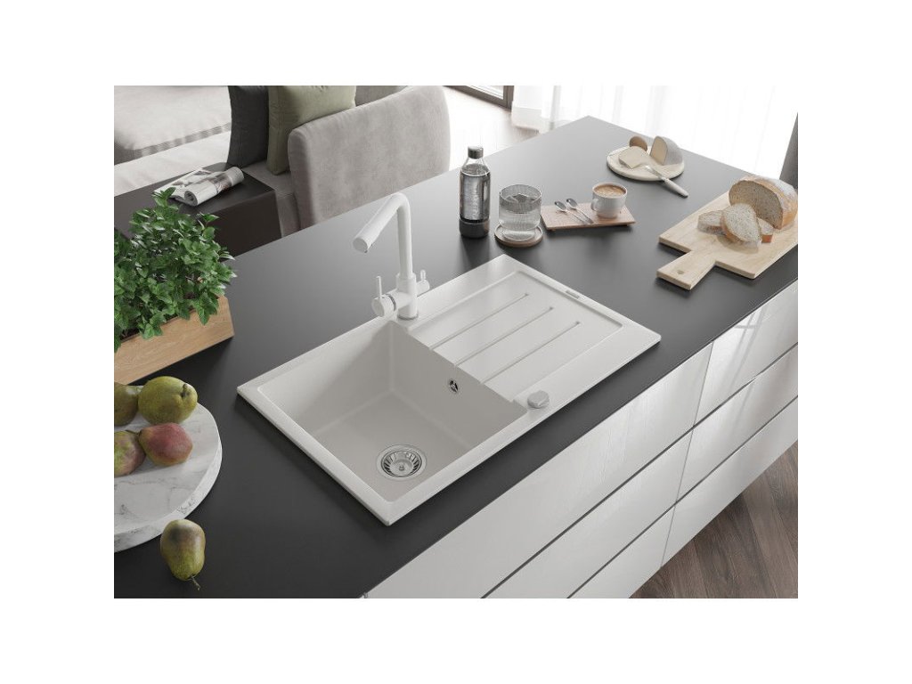 Granitový drez Mexen Bruno s 1 misou, odkapávačom a kuchynskou batériou Duero, biely - 6513-20-671600-20