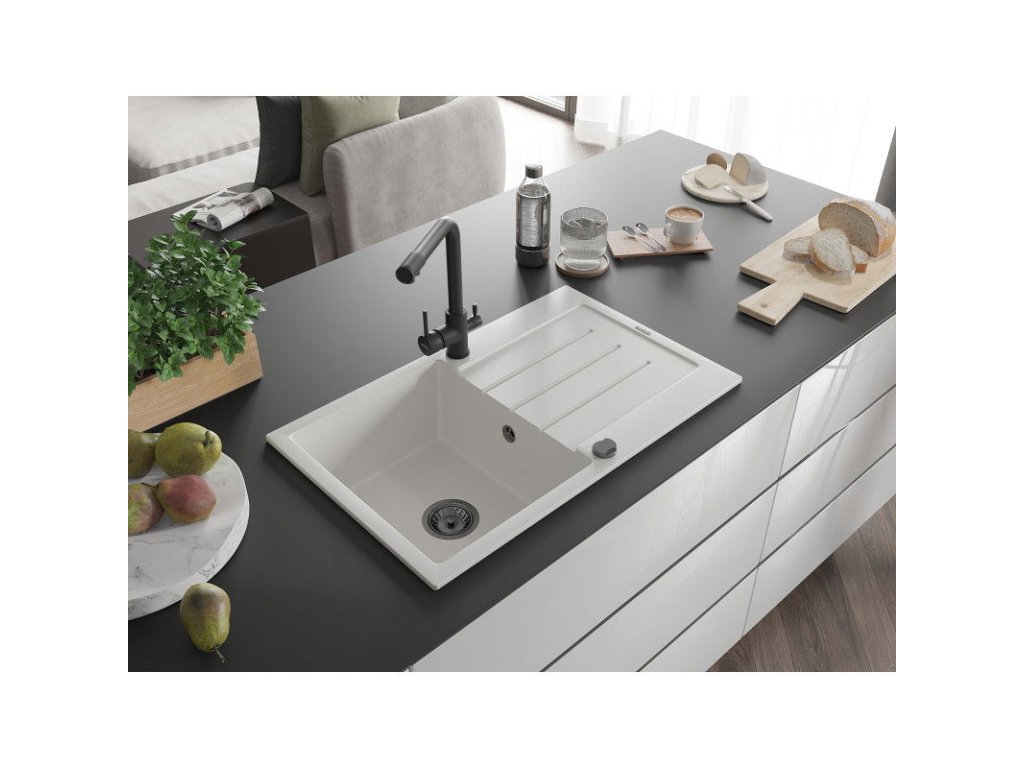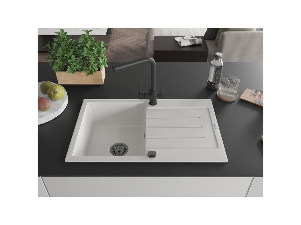 Granitový drez Mexen Bruno s 1 misou, odkapávačom a kuchynskou batériou Duero, biely - 6513-20-671600-70