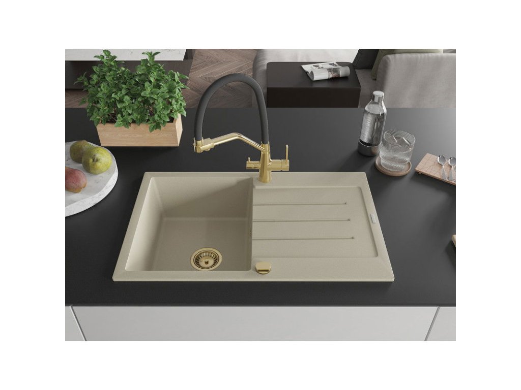 Granitový drez Mexen Bruno s 1 misou, odkapávačom a kuchynskou batériou Duo, béžový - 6513-69-671701-57-G