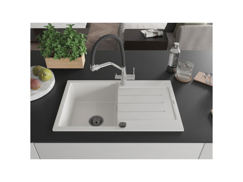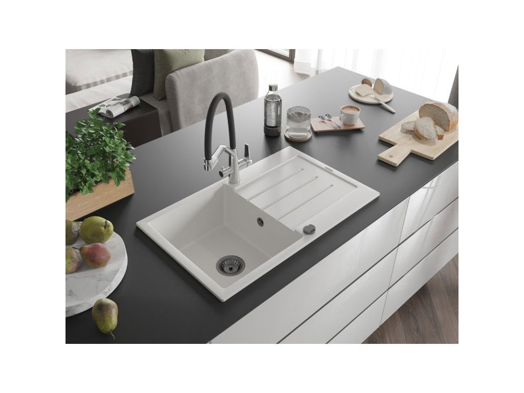 Granitový drez Mexen Bruno s 1 misou, odkapávačom a kuchynskou batériou Duo, biely - 6513-20-671701-07-B