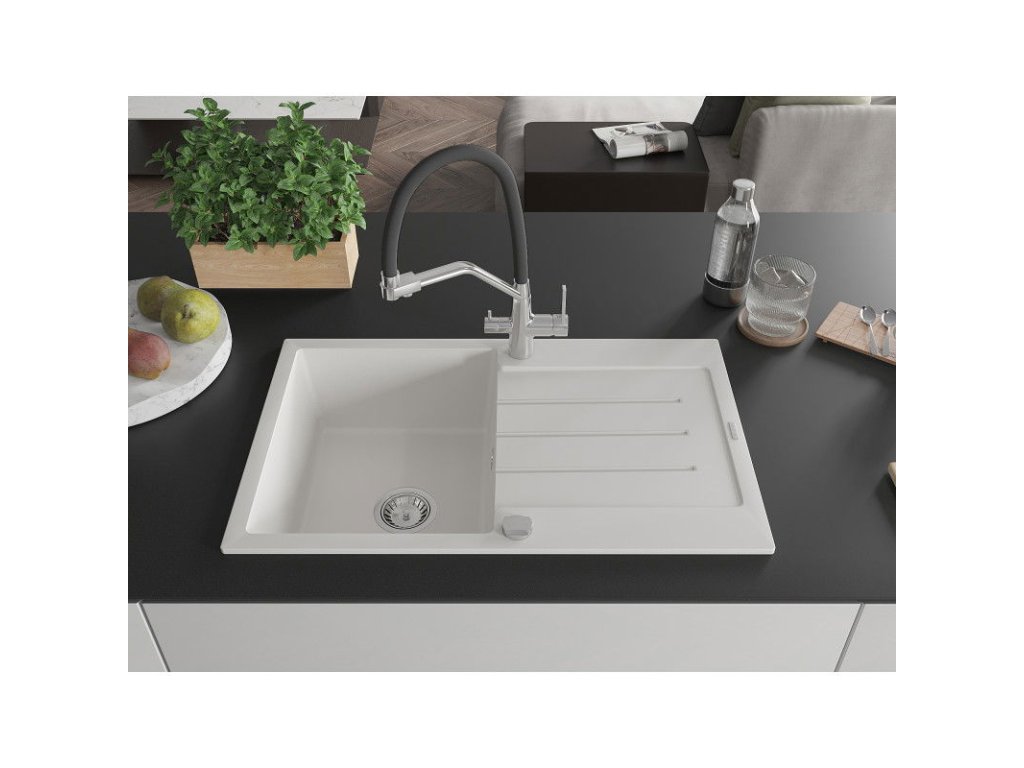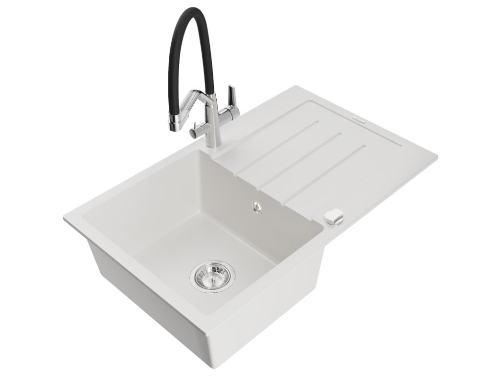 Granitový drez Mexen Bruno s 1 misou, odkapávačom a kuchynskou batériou Duo, biely - 6513-20-671701-07